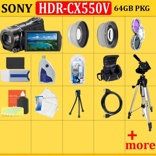 Buy Sony HDR-CX550V 64GB HD Handycam Camcorder + HUGE ACCESSORIES PACKAGE INCLUDING WIDE ANGLE MACRO LENS + 2X TELEPHOTO + 3 PC FILTER KIT + 4GB PRO DUO MEMORY CARD + 2x EXTENDED LIFE BATTERIES + CARRYING CASE + TRIPOD & MUCH MORE !! Now